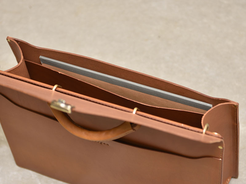クラシカルかつスマートなデザインの2wayタイプのブリーフケース。 ショルダーストラップを取り付けるための金具部分は、使用しない際にすっきりと収納できるギミックが備えてあります。 シンプルなデザインなので、その分ダコタレザーの滑らかで上品な風合いを充分に感じられるビジネスバッグに仕上がりました。
