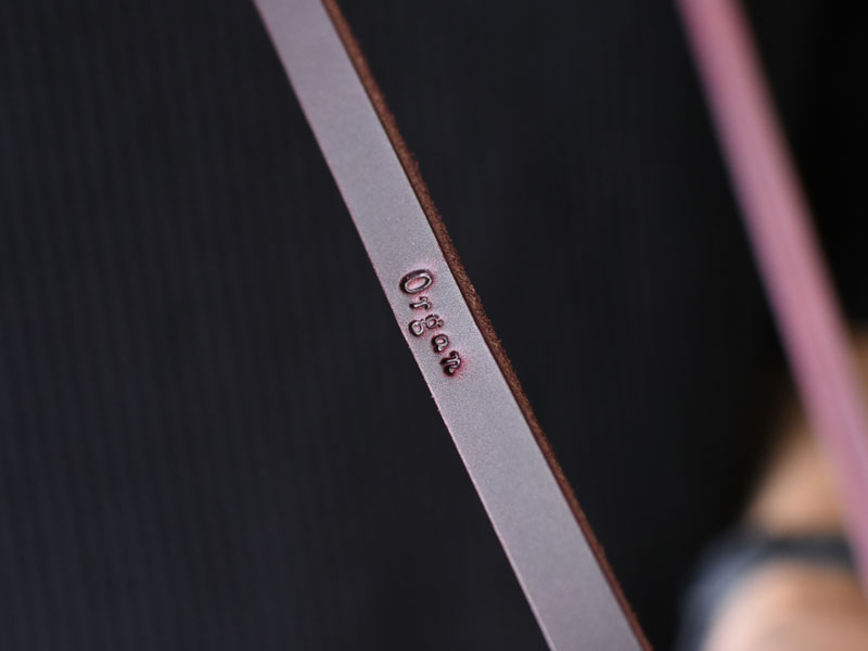 表面にはハリがあり、曲げると油分が移動して発色のいい色が出るプルアップレザー。芯まで染められている革なので、コバまで色鮮やかです。