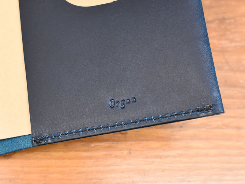 表面にはハリがあり、曲げると油分が移動して発色のいい色が出るプルアップレザー。芯まで染められている革なので、コバまで色鮮やかです。