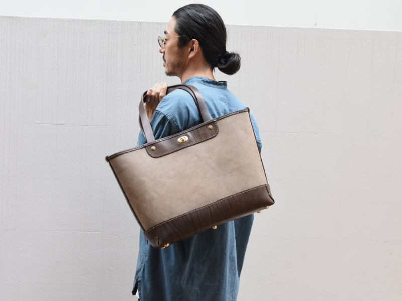 しっとりとした起毛が魅力の「ピアノサ」 と、ワイルドな個性を持つ革「ミッスーリ」。それぞれ強い個性を持つ革同士を組み合わせて作ったカバンです。