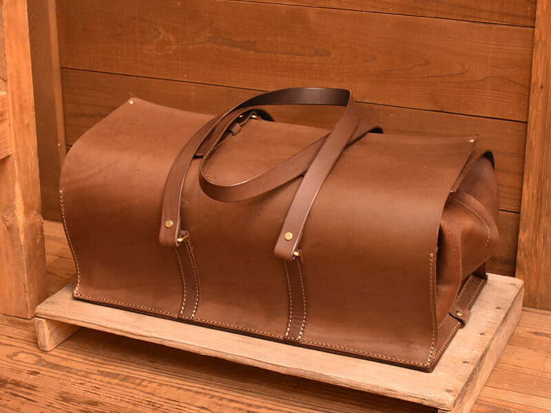マチの形が特徴的で、ギボシのベルトで留められたこの大きなボストンバッグ。